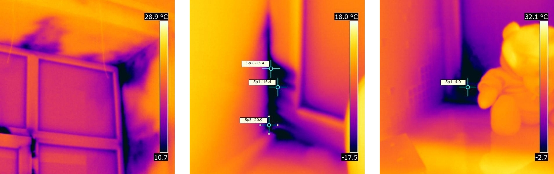 Цю проблему дуже наочно демонструє спеціальний тепловізорний аналіз. На зображеннях показані теплові карти, що виявляють слабкі зони проникнення холоду, в результаті неякісного або повної відсутності утеплення.